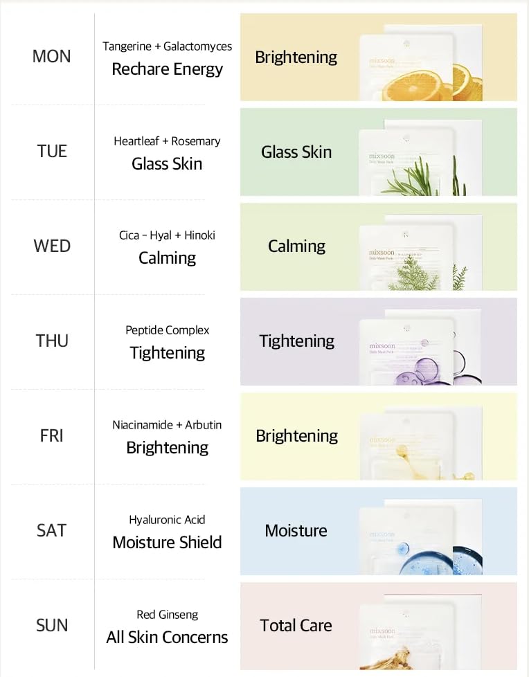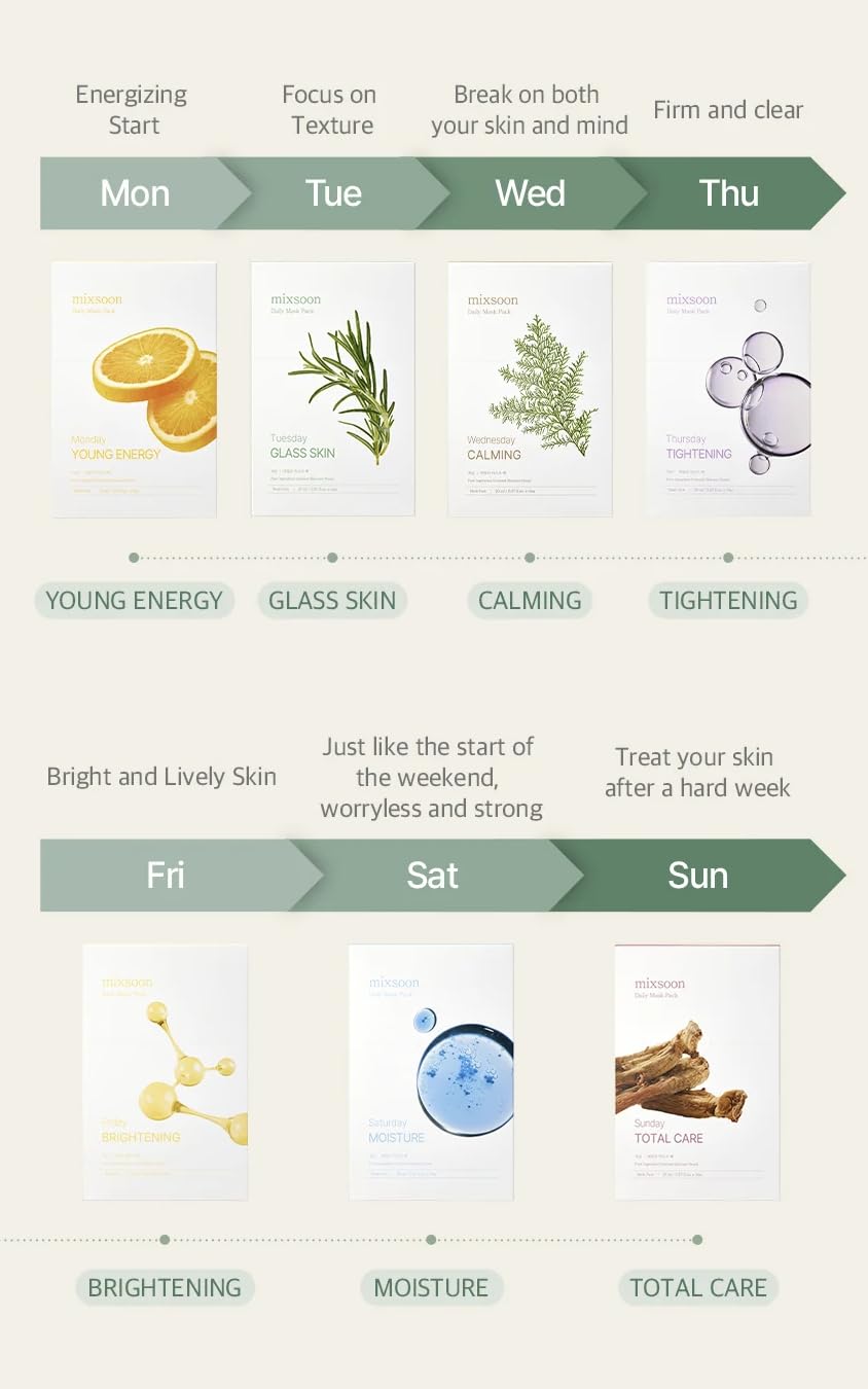 - Essence-Packed Mixsoon 7-Day, 7-Mask Routine: Experience a personalized weekly mask routine designed to match your skin's changing condition with one mask per day!